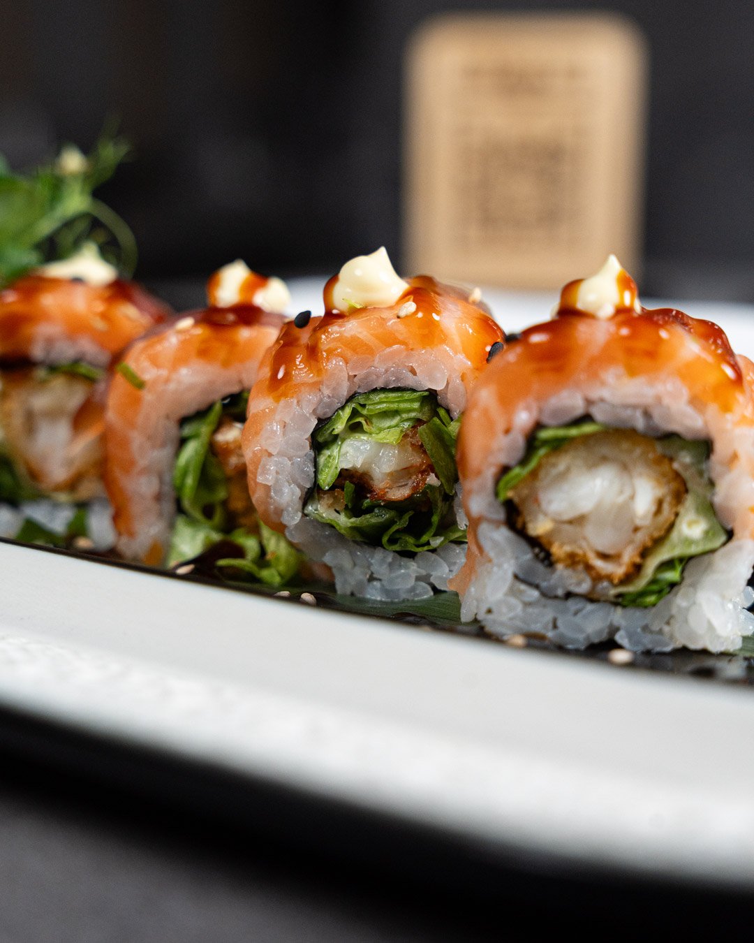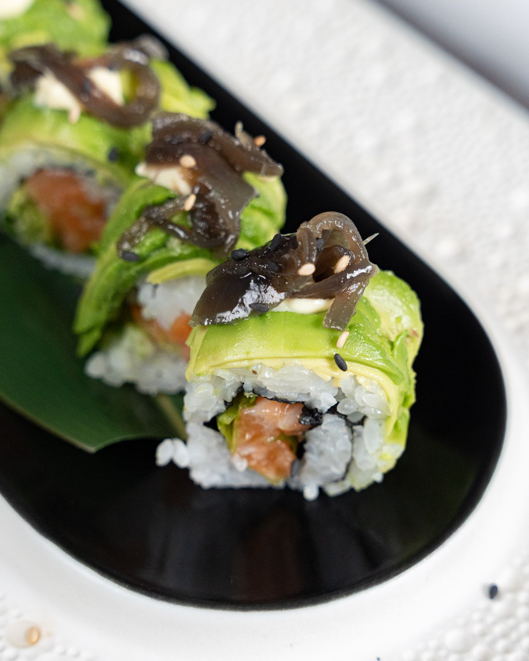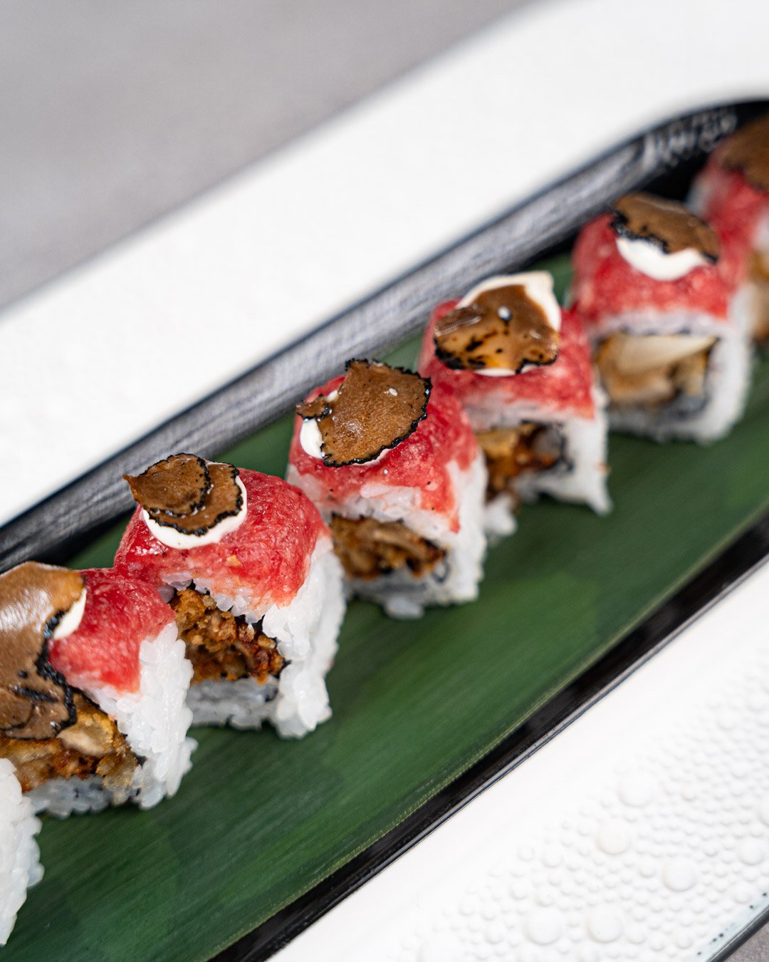 Ricciola, avocado, anguilla in salsa teriyaki, maionese, petali di tartufo